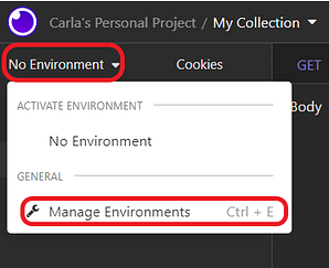 Lo primero que hice fue configurar el ambiente de trabajo. Para ello vamos al menú de ambientes y seleccionamos la opción Manage Environments o Ctrl+E: