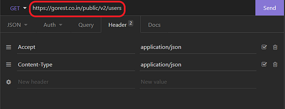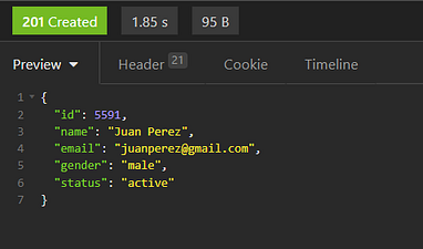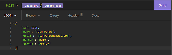 En el siguiente ejemplo en el proyecto de GoRest, usamos el id obtenido de la respuesta del método POST NewUser para enviar un pedido del tipo GET UserById. El dato lo pasamos como query del pedido:
