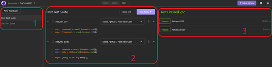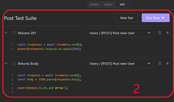 A diferencia de Postman o SoapUI, Insomnia ofrece una pestaña aparte para las pruebas. Anteriormente estábamos trabajando en la pestaña DEBUG con las peticiones y respuestas. Las pruebas unitarias se basan en el framework Mocha y Chai para las assertions, con JavaScript, según la documentación.