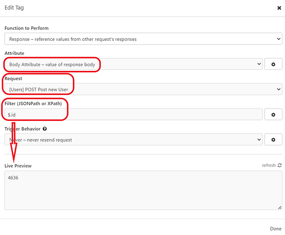 En Request debemos especificar a qué pedido hacemos referencia, lo seleccionamos de la lista desplegable. En Filter, que puede ser un JSONPath o XPath, ingresamos el dato que queremos obtener de la respuesta, que se visualizará en el recuadro Live Preview.
