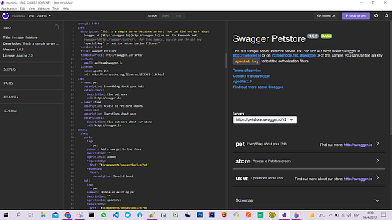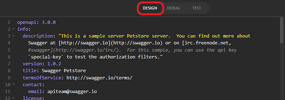 - También permite importar un swagger de la API en la pestaña DESIGN a partir de un archivo tipo yaml o ingresando manualmente el formato adecuado.