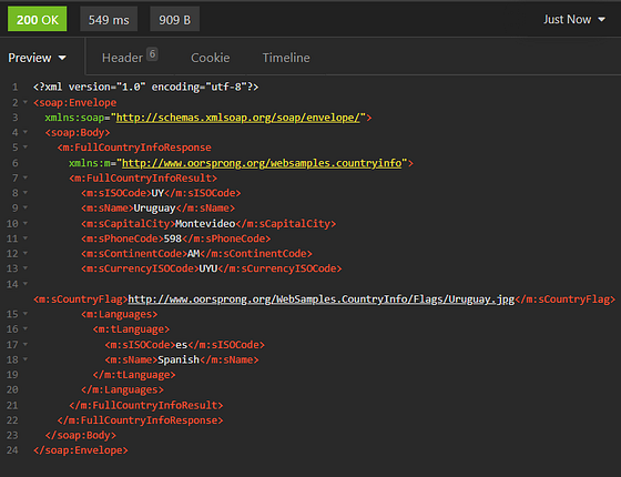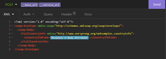 En el siguiente ejemplo en el proyecto de CountryInfoService, tomamos el ISO Code de la respuesta del pedido CountryByName y se lo pasamos al pedido FullCountryInfoByISOCode de la siguiente manera: