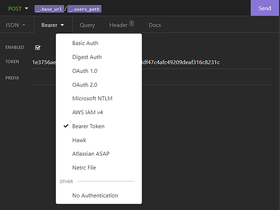 En el caso de la API que estamos probando, es necesario enviar un token de autorización que se puede agregar en la sección Auth seleccionando el tipo de autorización requerida: