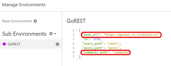 Con el nuevo ambiente creado, podemos hacer clic sobre el nombre para editarlo y comenzar a escribir los parámetros en formato JSON: