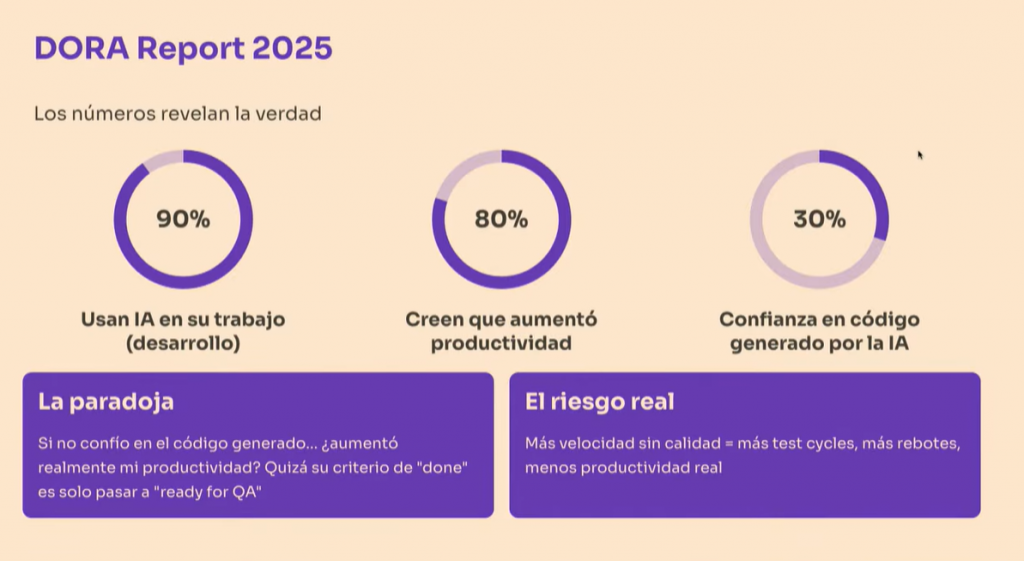 Sofía profundizó sobre la brecha existente entre lo que la IA puede hacer y lo que los equipos necesitan resolver, la Quality Intelligence Gap. “Parte de nuestro trabajo de este año fue ver no cómo automatizar más sino entender qué tenemos que probar y su impacto en el usuario y negocio, ya que estas son cosas que hoy la IA no puede responder”.